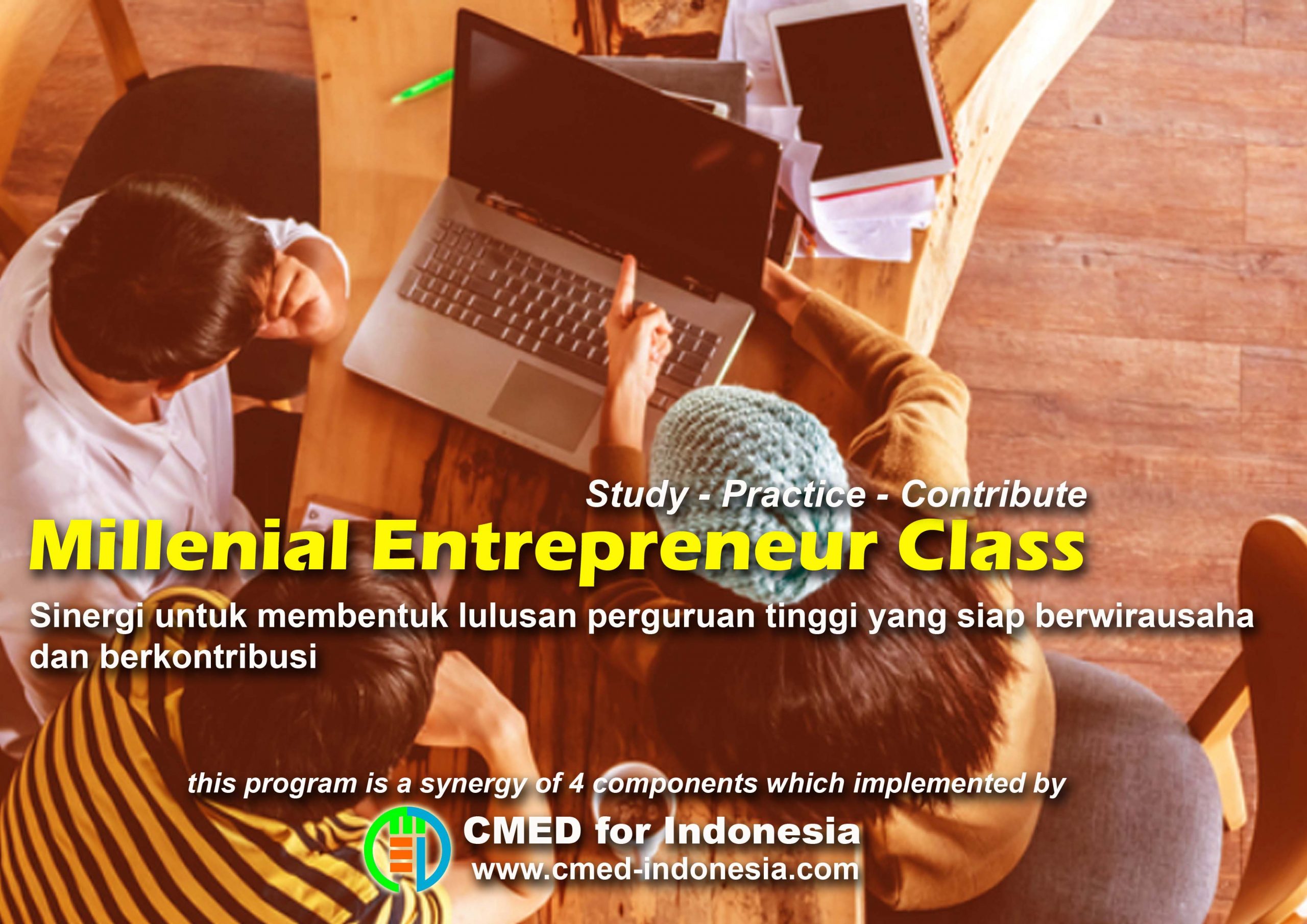 Millenial Entrepreneur Class Program adalah Program Pendidikan yang terselenggara atas sinergi 4 komponen, yaitu : Perguruan Tinggi, Badan Usaha Milik Desa (BUMDes), Digital Start Up Company, serta CMED for Indonesia. Untuk saat ini mitra perguruan tinggi dalam program ini adalah Sekolah Tinggi Ilmu Ekonomi (STIE) YPBI – Jakarta. Dengan program ini, kami mencoba menghadirkan program pendidikan dalam lingkup pendidikan tinggi / perkuliahan yang bersifat aplikatif dan solutif bagi pengembangan ekonomi masyarakat Indonesia, khususnya pada sektor UMKM dan pedesaan. Program pendidikan ini dilaksanakan dengan tetap mengikuti ketentuan resmi pemerintah, sehingga lulusannya tetap akan mendapatkan ijazah resmi dari perguruan tinggi terkait dan menyandang gelar Sarjana Ekonomi (SE).